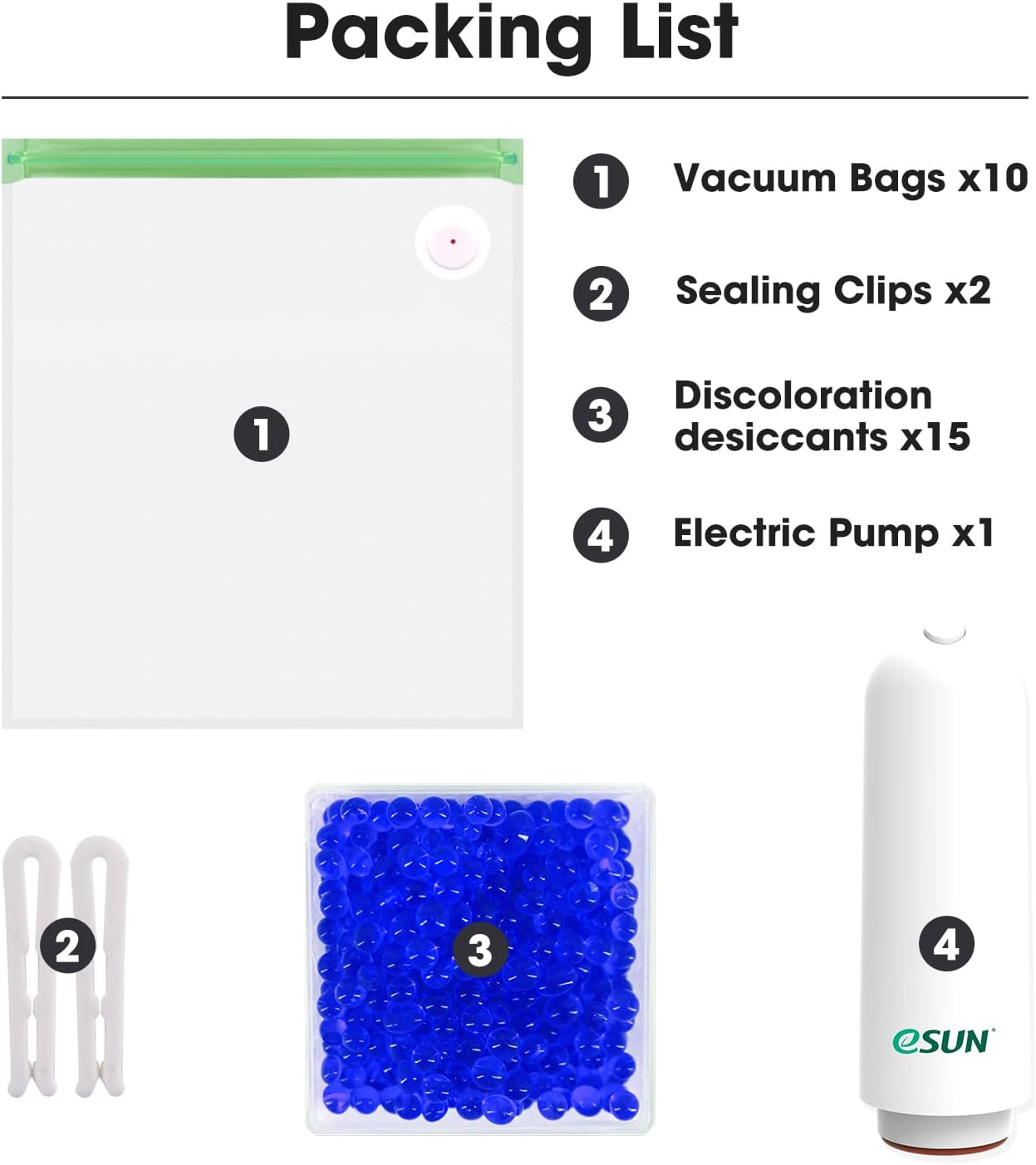 Others: sealing clip x2, desiccant x15 Note: When the humidity reaches 50%, it is recommended to replace the desiccant.